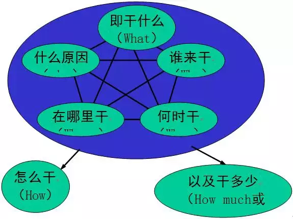 5W2H谈不上是一种管理思想,准确的说应该是一种做事的要求,它基本上涉及我们工作中的每一件事。表面看上去,这很简单,但我们却很难把它做好,在这个问题上吃亏举不胜举,因此而发生的浪费太多太多,这方面很多企业管理者这样描述,由于工作沟通和工作安排上的错进错出,给企业带来的损失,“就像甘美的山泉,在默默的流失,而管理者大都熟视无睹”。所以特此在这以思想的形式给以提出,希望得到大家的重视,而这在EAM中,是推行的基础。图示说明见图: